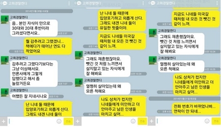 그러자 고승덕 후보는 "나도 상처가 컸지만 너네들에게 미안하고 더 안아주고 남은 인생을 마치고 싶어"라고 미안한 마음을 고백했다. 하지만 며칠 뒤 "전화번화가 바뀌었나봐. 연락이 안 되네"라는 고승덕 후보의 메시지를 끝으로 두 사람의 대화는 끊어졌다.