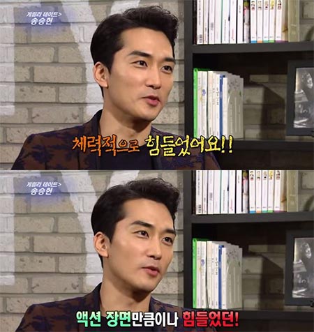 이날 방송에서 '인간중독'에서 파격적인 베드신을 선보인 송승헌은 "베드신이 떨리기보다 체력적으로 힘들었다. 액션 장면만큼 힘들었다"며 고충을 토로했다. 이어 그는 "(베드신을) 몇 시간이 아니라 며칠에 걸쳐 찍었다. 사실 쉽게 봤는데 정말 힘들었다"고 전했다.