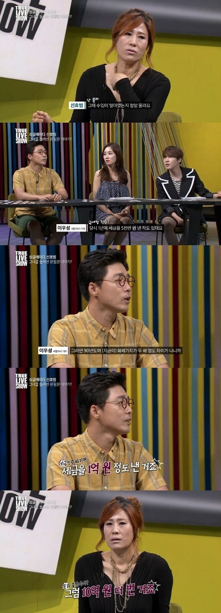 이날 신효범은 "과거 전성기 때 수입이 엄청났을 것 같다"는 질문에 "난 그때 수입이 얼마였는지 모른다. 돈에 대한 개념이 없었다"고 답했다. 이에 함께 출연한 이우성 기자는 "당시 신효범이 1년에 세금 5천만 원을 냈다. 지금은 화폐가치가 두 배 차이 나니까 1억 정도 낸 거다. 그럼 10억 정도 번 것"이라고 말해 놀라움을 자아냈다.