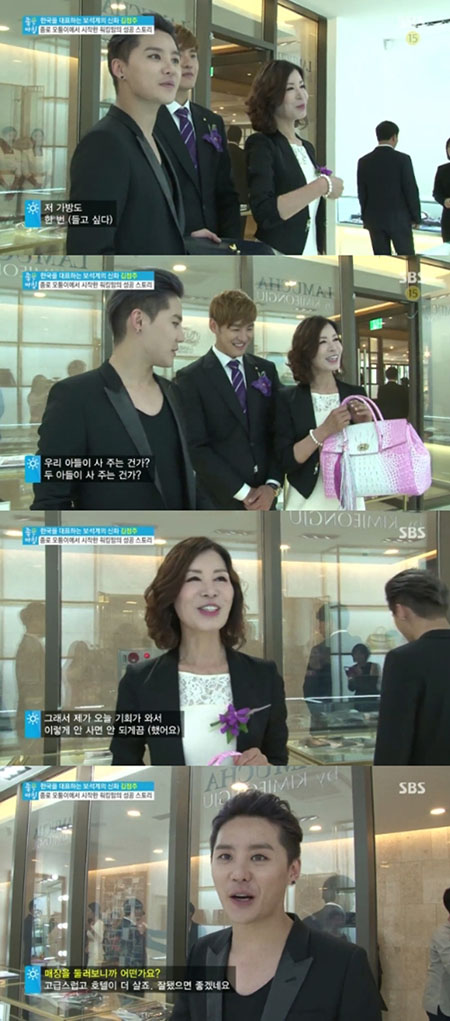 이날 방송에서 김준수 어머니는 김정주가 디자인한 가방을 보고 "저 가방도 한번 들고 싶다"고 말했다. 이에 김준수는 "우리 어머니 좋아하는 스타일이다"라며 가방을 건네받았고, 김준수 어머니는 "우리 아들이 사주는 건가? 두 아들이 사주는 건가?"라고 말했다.
