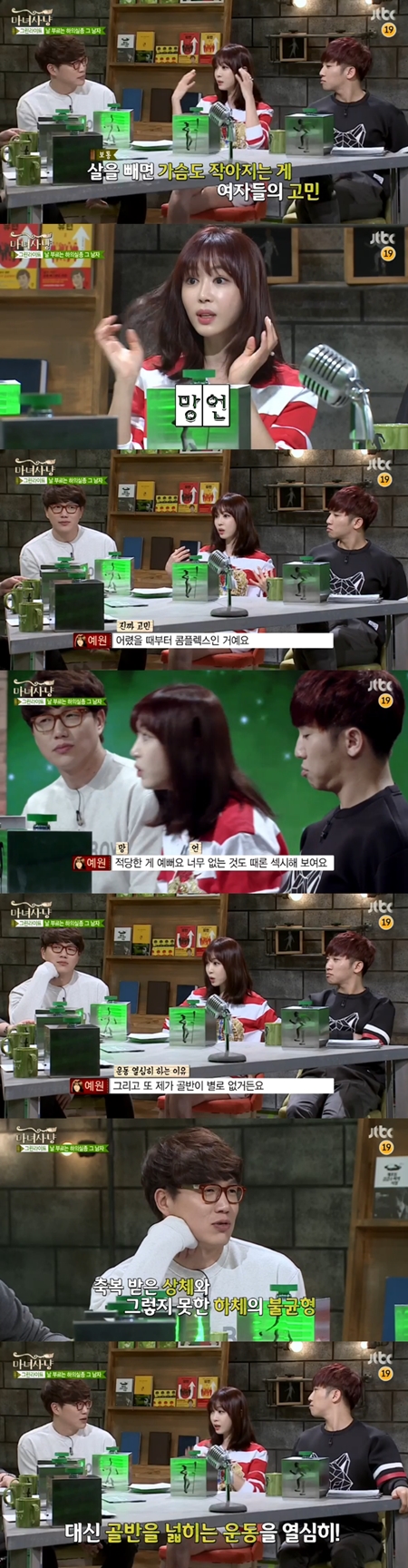강예원은 "보통 살을 빼면 가슴도 작아지는 게 여자들의 고민이다"며 "그런데 나는 가슴 쪽 살이 잘 빠지지 않는 게 고민이다"고 말했다.