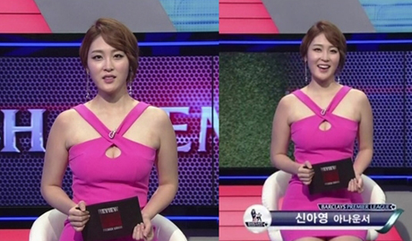 공개된 사진은 과거 SBS ESPN 간판 아나운서로 활동했던 신아영의 모습으로 가슴과 아찔한 쇄골라인이 드러나는 핑크색 톤의 미니 원피스를 입고 섹시한 매력을 과시했다. 특히 신아영은 가슴이 뚫린 드레스 탓에 가슴골이 노출돼 눈길을 끌었다.