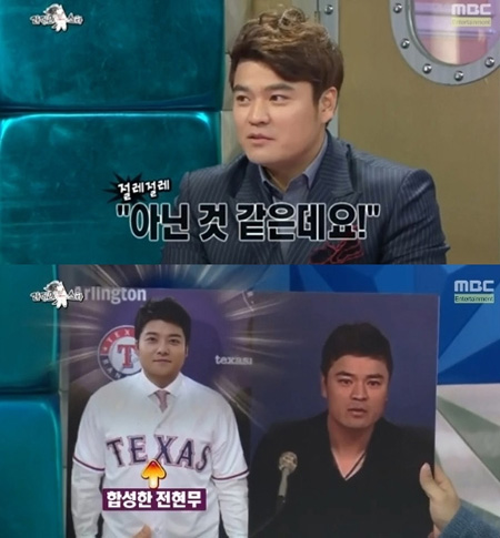 그럼에도 불구하고 MC들은 텍사스 레인저스 유니폼을 합성한 전현무의 사진을 준비해 추신수와 비교하며 닮은꼴 외모를 인증했다. 결국 추신수는 "얼굴형이 좀 닮은 것 같다"며 씁쓸하게 인정했다.