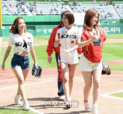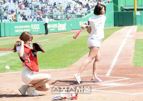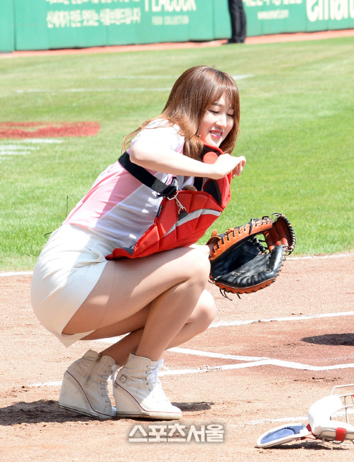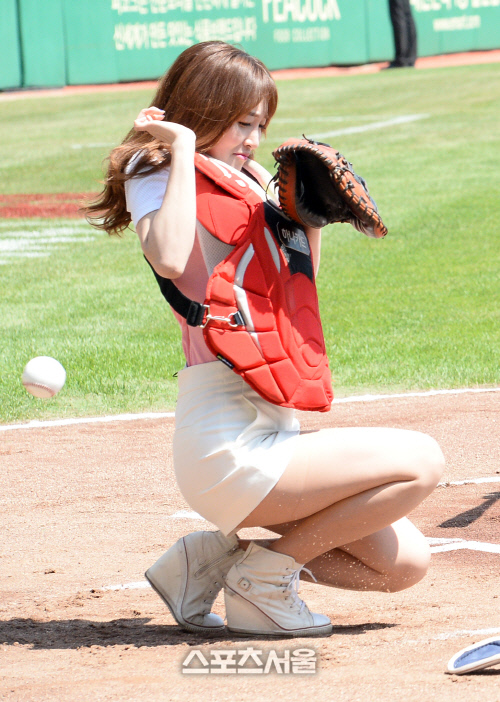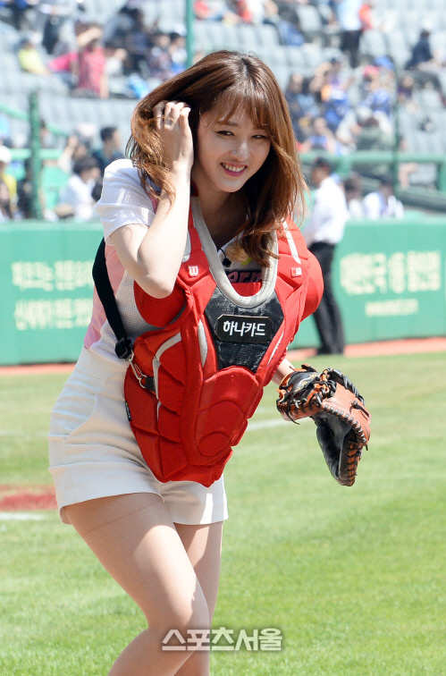 [스포츠서울] 10일 문학구장에서 열린 2015 프로야구 KBO리그 SK와 삼성의 경기에 앞서 SBS스포츠 ‘야구 앤더 시티’의 진행자 신아영 아나운서가 시포를 마친 뒤 공이 지나쳐간 곳을 바라보고 있다.