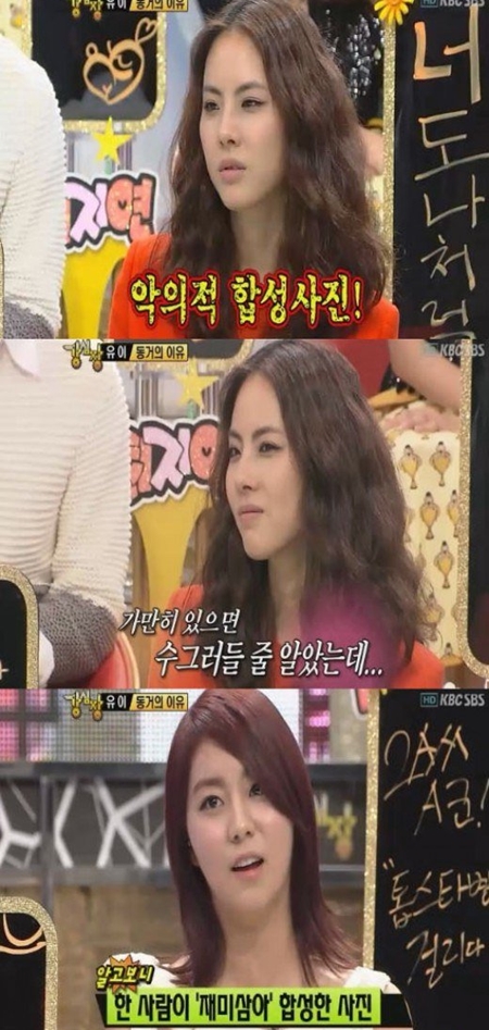 이날 유이는 "어느 날 엄마한테 '무슨 일 없지'라는 내용의 전화가 왔는데 알고 보니 동네 사람들 사이에서 합성사진과 관련한 루머가 돌았다"고 밝혔다.