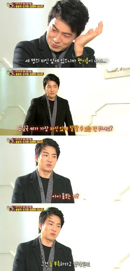 송일국은 "가장 자신 있게 잘할 수 있는 건 무엇이냐. 아이 돌보는 것?"이라는 질문에 "(삼둥이 돌보는 건) 늘 부족하다고 생각한다"라고 겸손한 모습을 보였다.