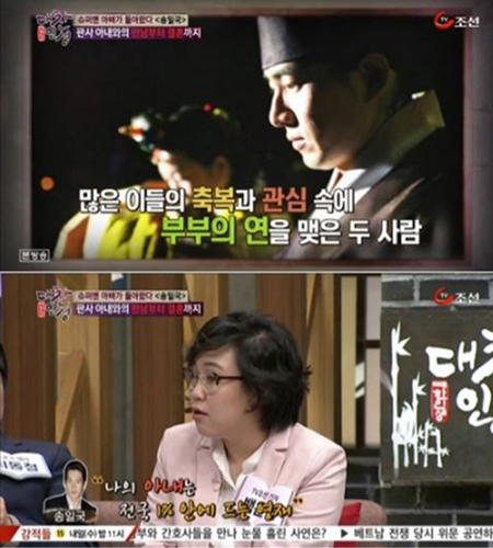 지난 3일 방송된 종합편성채널 TV조선 '대찬인생'에서는 송일국과 아내 정승연 판사의 러브스토리를 공개했다.