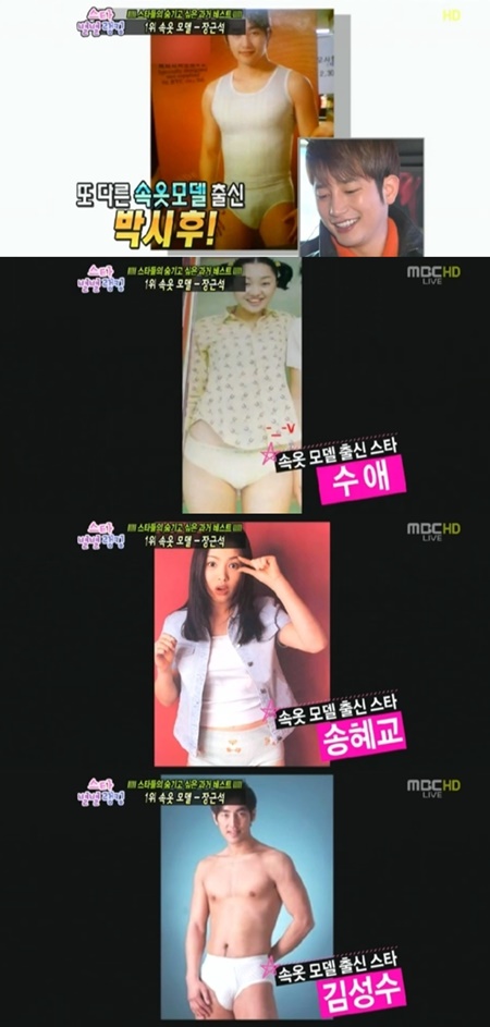 이날 방송에서 1위는 어린 시절 속옷모델을 했던 장근석이 차지했다. 이 가운데 연예계 속옷모델 출신 배우들이 공개됐고, 수애와 송혜교, 박시후, 김성수 등이 거론됐다.