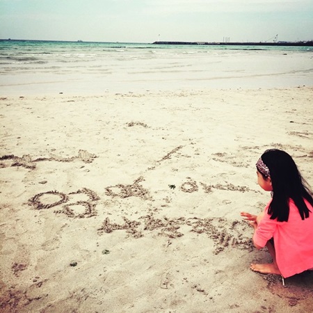 공개된 사진 속에는 제주도의 한 해변 모래사장에서 엄마와 아빠를 향한 글을 적고 있는 민서 양의 모습이 담겼다.