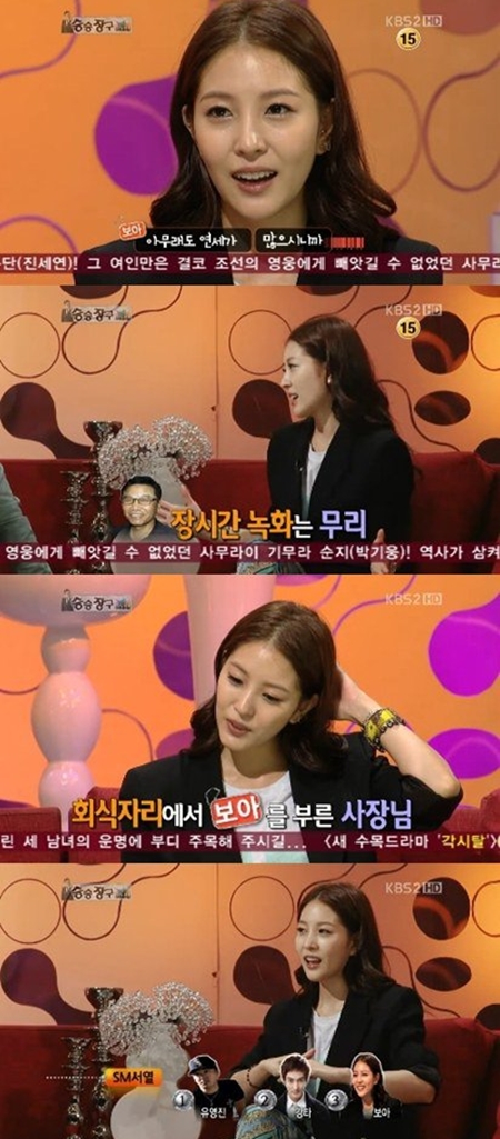 이날 보아는 SBS 예능프로그램 '일요일이 좋다-K팝스타'에 이수만 사장이 아닌 보아가 나선 이유에 대해 "아무래도 연세가 많으시니까. 장시간 녹화다"라고 말해 웃음을 자아냈다.
