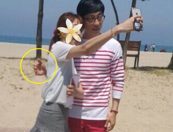 공개된 사진 속 유재석은 해수욕장 백사장서 흰색 스프라이트 티셔츠를 입은 채 A씨와 셀카를 찍고 있다.