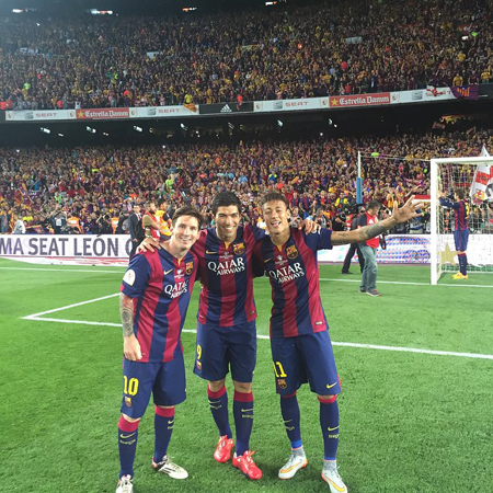 공개된 사진 속에는 다정하게 어깨동무를 한 채 우승의 기쁨을 만끽하고 있는 메시, 수아레스, 네이마르의 모습이 담겼다.