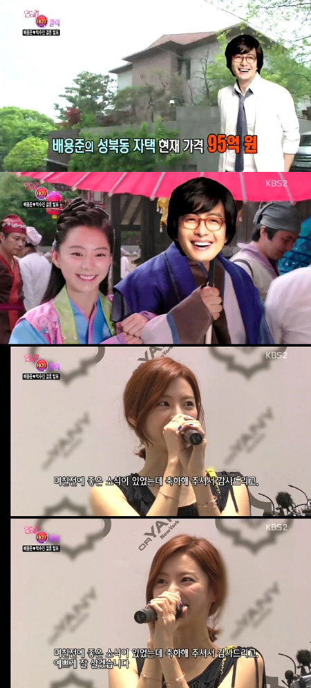 지난달 16일 방송된 KBS2 연예정보 프로그램 '연예가중계'에서는 최근 결혼 소식을 전한 배용준, 박수진의 열애부터 신혼집까지에 대해 이야기했다.