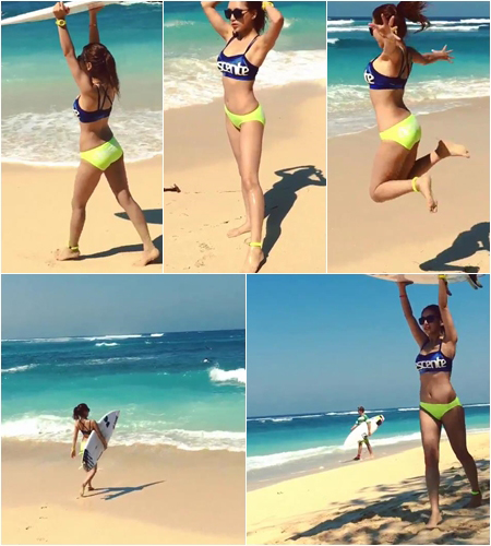 이날 공개된 영상 속 예정화는 푸른색 상의에 연두색 하의의 비키니로 군살 없는 몸매를 자랑했다. 이어 예정화는 점프를 하는 등 상큼 발랄한 모습으로 귀여움과 섹시함을 동시에 과시했다.