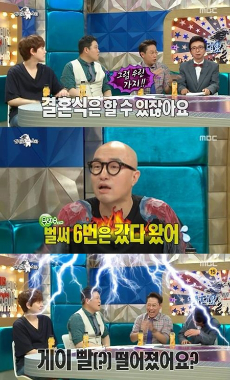 이어 MC 김구라가 홍석천에게 "결혼식 올리는 것도 연예인으로서 괜찮다고 본다"고 말하자 홍석천은 "커밍 아웃 빨, 게이 빨 떨어졌다. 이제 결혼 빨로 가야 하느냐"고 자학해 녹화장을 웃음바다로 만들었다.