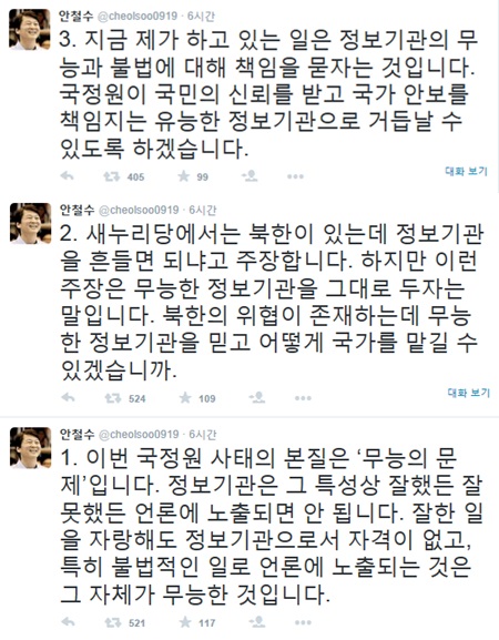 24일 안철수 의원은 자신의 트위터에 "이번 국정원 사태의 본질은 '무능의 문제'입니다"라는 장문의 글을 게재했다.