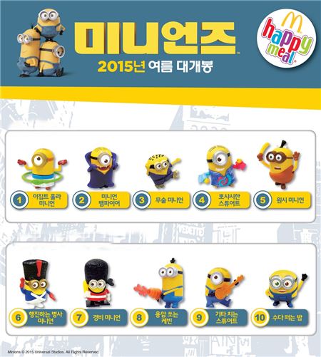 또한 다음 달 9일 오후 3시부터는 또 다른 5종의 미니언 토이로 구성된 2차 미니언 해피밀 스페셜 세트가 마찬가지로 매장당 100개씩 한정 수량으로 판매되며, 10일 자정부터는 2차 일반 미니언 해피밀 세트가 판매될 예정이다.