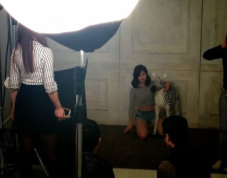 공개된 사진에는 허리라인이 드러나는 짧은 크롭 니트에 핫팬츠 차림으로 얼룩말 인형 옆에서 무릎을 꿇고 포즈를 취하고 있는 최정문의 모습이 담겨있다.