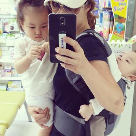 당시 공개된 사진 속에는 이지현이 앞으로는 딸 김서윤 양을 안고, 뒤로는 아들 김우경 군을 업고 휴대전화로 셀프 카메라를 찍는 모습이 담겨있다.