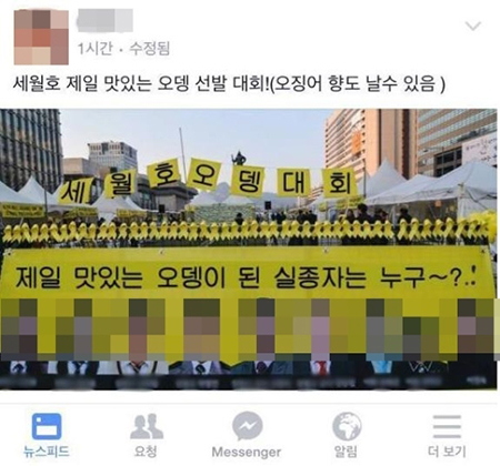 사진 속 대형 현수막에는 '제일 맛있는 오뎅이 된 실종자는 누구?'라는 문구 아래로 아직도 돌아오지 못한 세월호 실종자 9명의 얼굴 사진이 나와 있다.