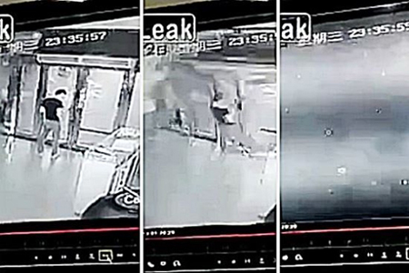이 남성은 유리문 앞에 서서 문을 열고 나가려고 하는 순간 문과 사람이 순식간에 날아가며 화면이 멈췄다.