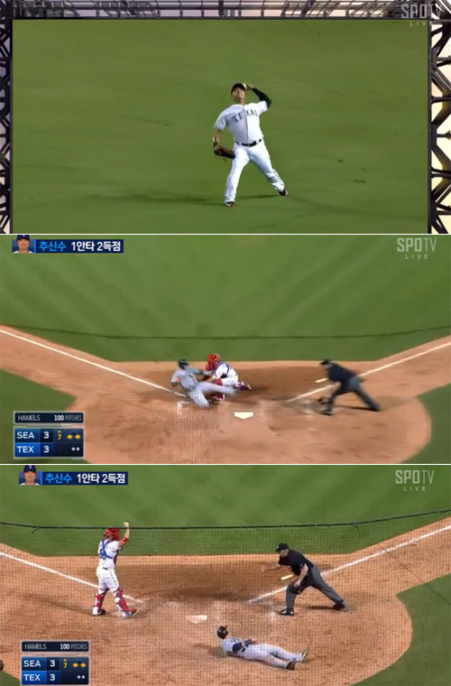 추신수는 3-3 동점으로 맞선 7회초 1사 1, 3루 상황에서 카일 시거의 뜬공을 잡은 뒤 노바운드로 정확하게 송구해 홈으로 뛰던 3루 주자 로건 모리슨을 잡아냈다.
