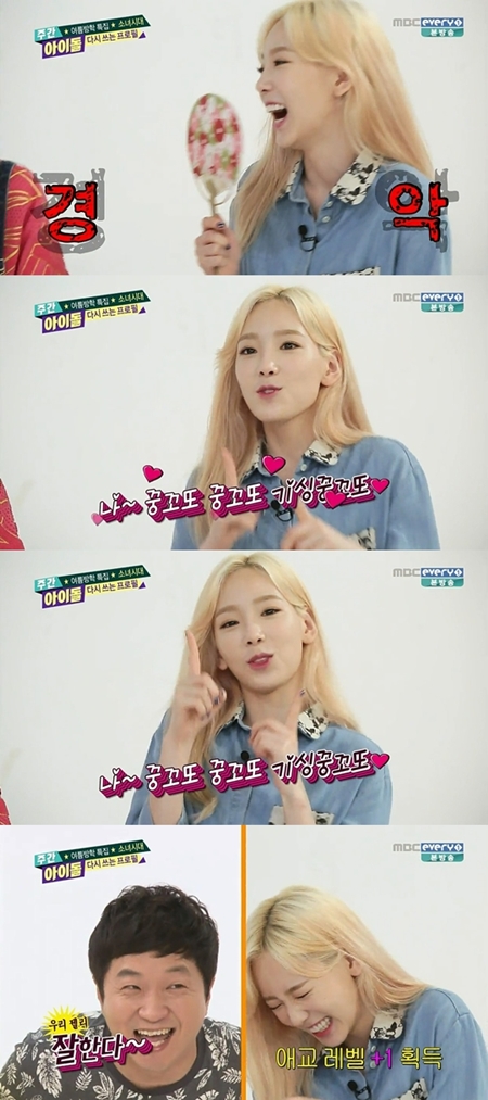 지난 19일 방송된 MBC 에브리원 '주간 아이돌'에서 소녀시대 태연은 애교를 보여달라는 정형돈의 말에 '기싱꿍꼬또' 애교를 선보였다.