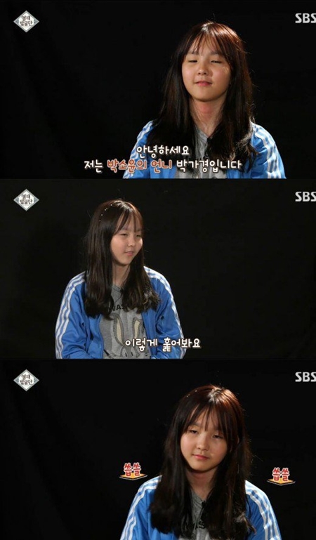 이날 박가경 양은 공부도 잘 하고 노래도 잘 하고 하나를 알려주면 열을 아는 끼 많은 동생 박소윤 양 때문에 스트레스가 많다고 이야기했다.