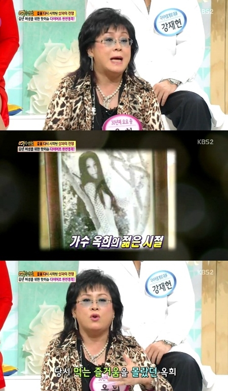 사진을 본 MC들은 감탄하며 "정말 날씬했다. 어떻게 살이 찌게 됐냐"고 물었다. 이에 옥희는 "처녀시절 40kg이었다. 마른 몸이 싫어서 목욕탕도 안 가고 33사이즈 옷도 줄여 입었다. 살찌는 게 소원이었다"고 전해 듣는 이들을 놀라게 했다.