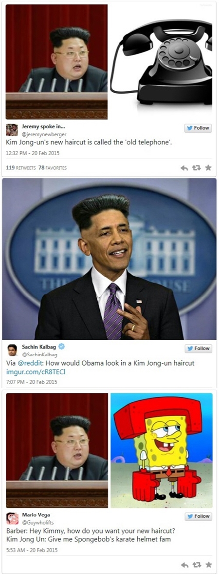 미국 대통령인 버락 오바마의 모습에 김정은의 머리 스타일을 합성한 이도 있었다. 또한 어떤 사람은 마치 버섯구름 같다고 이야기했으며 애니메이션 스폰지밥의 헬멧과 비슷하다는 의견도 있다.