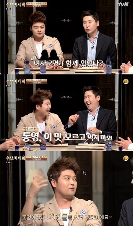이날 신동엽은 "이번에 전현무 씨가 직접 통영에 다녀왔다. 바쁜데 흔쾌히 갔다 왔다"며 "근데 제작진이 제보를 해 주더라. 통영에서 묘령의 여인 두 분과 함께 있는 것을 목격했다고 하더라"고 말했다.