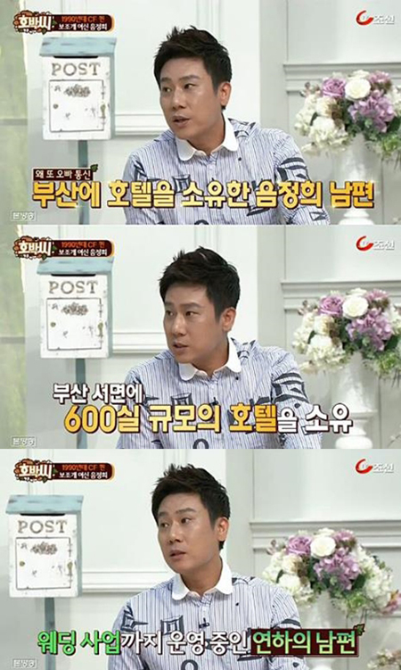 이어 이상민은 "(음정희의 남편이) 부산에 호텔을 갖고 있다"면서 "서면에 600실 규모의 호텔이다. 웨딩 사업도 하고 있다. 음정희보다 나이가 어리다"고 덧붙여 더욱 놀라움을 자아내게 만들었다.