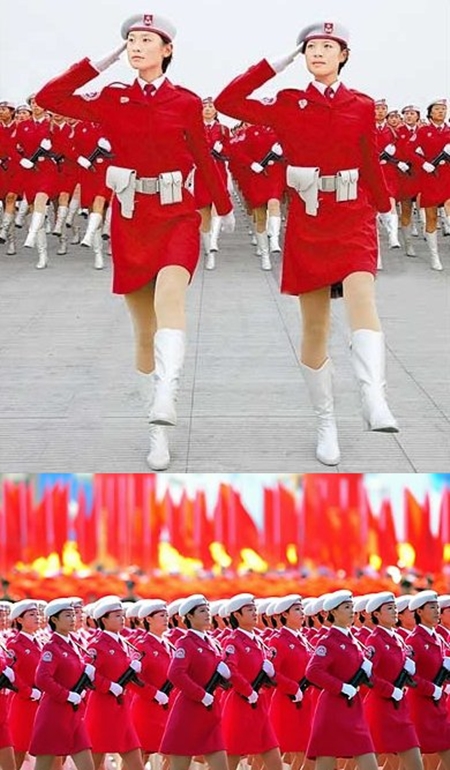중국의 건국 60주년 기념 군사퍼레이드(열병식)에 핑크빛 미니스커트, 흰색 가죽 부츠, 흰색 베레모를 쓰고 멋진 화장을 한 체 참가한 미녀 여군의장대들이 화제다.