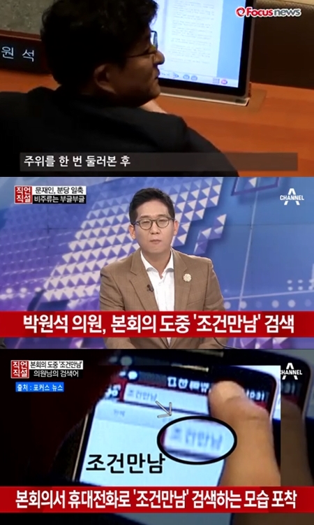 지난 2일 한 매체가 공개한 동영상에 따르면 박 의원은 이날 새누리당 김무성 대표가 국회 본회의에서 교섭단체 대표 연설을 하는 동안 자신의 휴대폰으로 자신에 관한 기사와 스포츠 기사 등을 검색했다. 이어 박 의원은 갑자기 주위를 둘러보더니 자신의 휴대폰에서 검색어에 '조건만'을 쳤다. 뒤이어 주위를 둘러본 뒤 마저 '남'을 입력, '조건만남'을 검색했다.