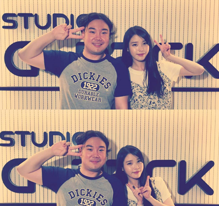공개된 사진 속에는 박명수 스튜디오서 아이유와 함께 브이를 그리며 깜찍한 표정을 짓고 있는 유재환의 모습이 담겼다.
