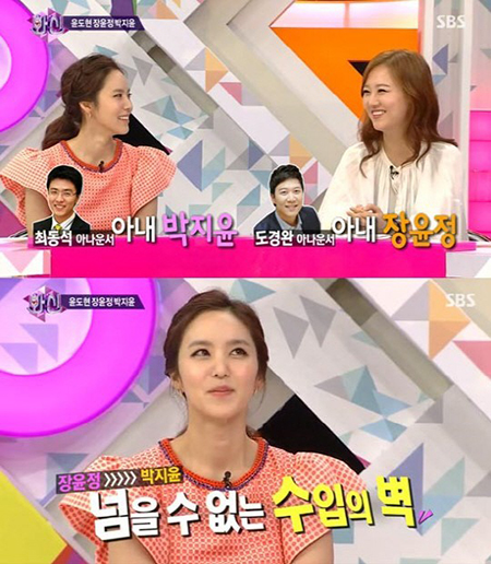 이에 MC김구라는 "남자 아나운서의 아내들 중 수입 랭킹 1위가 박지윤씨다"고 말하자, 박지윤은 "비공식적이다"며 콕 집어 이야기했다. 이어 김구라는 "박지윤은 이제 전직 1위이고, 현직 1위는 장윤정이다"고 말해 스튜디오를 폭소케 했다.
