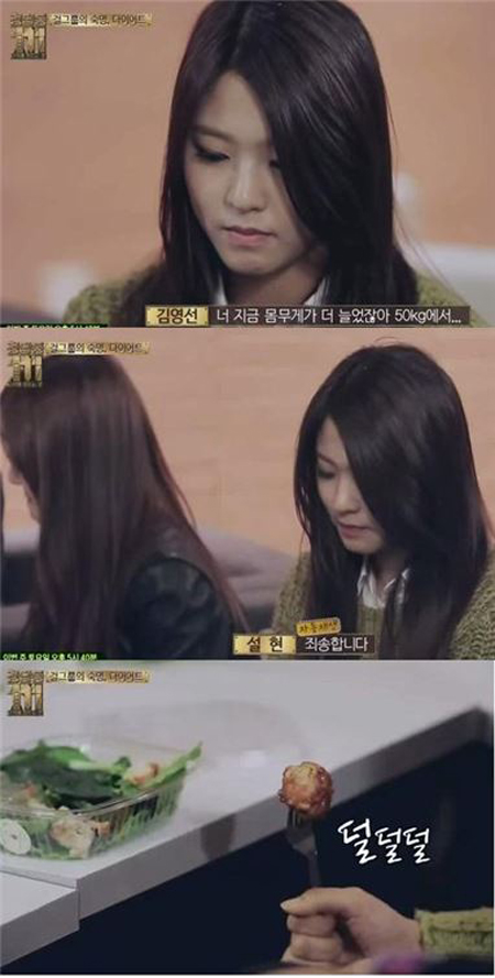 때마침 들어온 김영선 FNC 엔터테인먼트 이사는 설현에게 "네가 지금 치킨 먹을때니"라며 "너 지금 몸무게가 더 늘었잖아 50㎏에서"라고 타박했다.