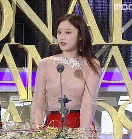 이날 이성경은 누드톤의 시스루 톱과 레드 스커트를 입고 등장했다. 특히 속옷과 가슴 라인이 고스란히 노출돼 보는 이들을 민망하게 만들었다.