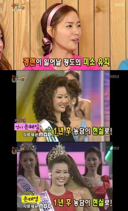 당시 방송에서 손태영은 지난 2000년 미스코리아 대회 당시를 회상하며 "웃는 연습을 너무 많이 하고 나갔더니 얼굴에 경련이 일어났다. 가체도 너무 무겁고 상이 문제가 아니라 정말 죽고 싶은 심정이었다"라고 웃음을 지었다.
