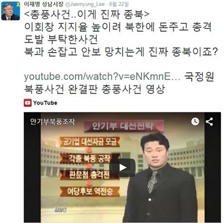 이재명 성남시장은 지난달 22일 자신의 트위터를 통해 "총풍사건..이게 진짜 종북"이라며 "이회창 지지율 높이려 북한에 돈 주고 총격 도발 부탁한 사건. 북과 손잡고 안보 망치는 게 진짜 종북이죠?"라는 글을 올렸다. 당시 사건을 보도한 방송 뉴스 영상도 함께 게재했다.