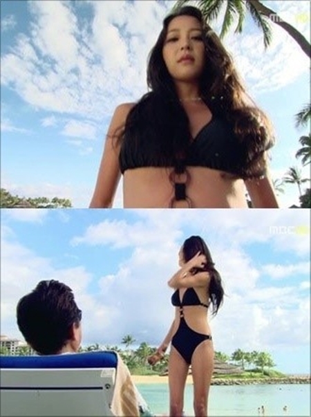 배와 가슴 부분이 연결된 검은색 비키니는 한고은의 날씬한 몸매를 부각시켰다. 이를 강조하려는 듯 카메라도 한고은의 몸매를 의도적으로 훑어 내려갔다.