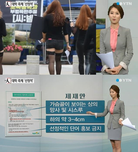 이 같은 논란 속에 지난해 한 여대에서는 가슴골 노출 금지, 시스루 의상 금지 등 구체적인 규제를 담은 축제 규정안을 배포해 찬반 논란을 빚기도 했다.