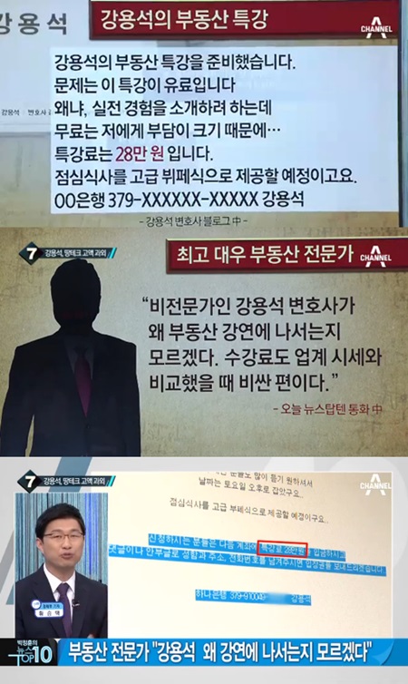 이 가운데 강용석의 특강료는 28만원으로 알려졌는데, 한 부동산 전문가는 "비전문가인 강용석이 왜 부동산 강연에 나서는지 모르겠다. 수강료도 업계 시세와 비교했을 때 비싼 편이다"라고 평가했다.