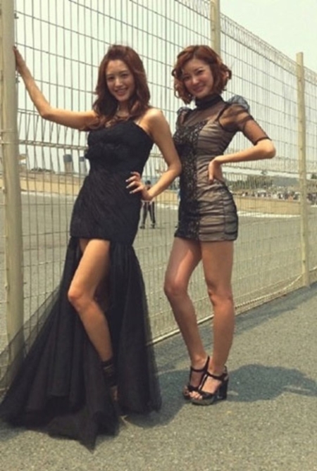 사진 속 김재경과 NS윤지는 블랙 계통의 미니드레스를 입고 한쪽 허리에 손을 올린 채 각선미를 뽐내고 있다.