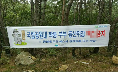 공개된 사진 속에는 '국립공원내 짝퉁 부부 등산위장 oo금지'라는 낯 뜨거운 문구와 함께 '공원내 무단 OO시 관련법에 의거 처벌'이라는 작은 글씨가 적혀있다.