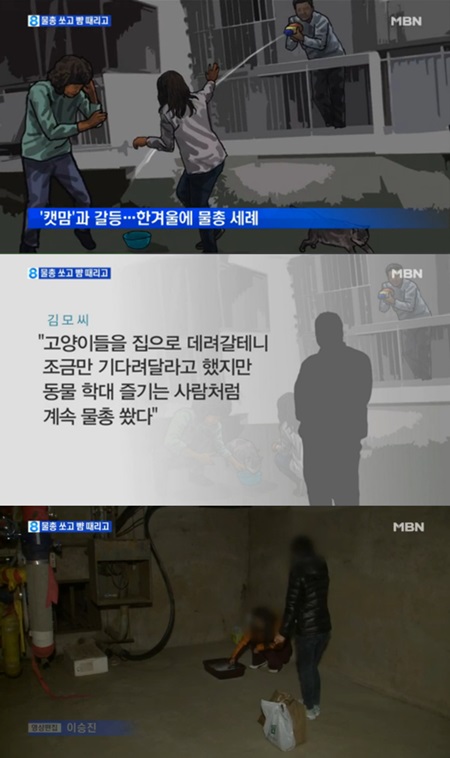 한겨울에 물총의 차가운 물줄기를 맞은 길고양이들은 울부짖으며 도망갔고, 모녀는 가장인 김모씨에게 이 사실을 털어놨다. 화가나서 현관 인터폰을 주먹으로 친 김씨는 결국 재물손괴 혐의로 입건됐다.