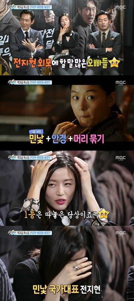 이정재는 "전지현이 영화 속에서 민낯에 안경을 쓰고 머리도 묶었지만 그래도 예뻤다. 거의 최고다"고 말했다.