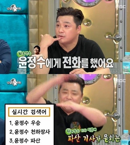 이날 윤정수는 "씨름선수 윤정수 씨가 장사 타이틀을 많이 땄다. 파산 기사가 장사 기사에 묻혔다"고 말했다. 그러면서 "너무 고맙다고 전화했다"고 덧붙였다.