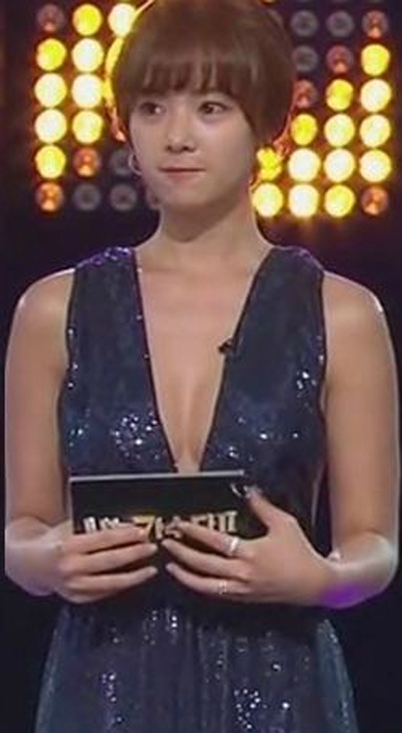 이날 황정음은 가슴라인이 훤리 보이는 남색 드레스를 입고 등장했다. 특히 생방송 경연을 위한 조 추첨 도중 황정음의 가슴 부위가 부각됐다.