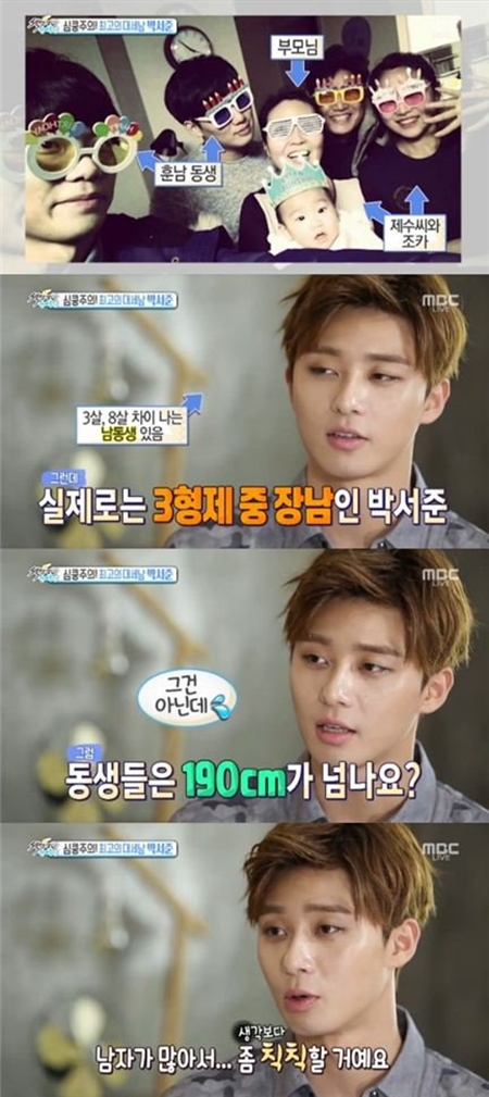185cm인 박서준은 "(동생이) 190cm가 넘는 것은 아니고 조금씩 더 큰데 아무래도 덩치들이 크다 보니 오히려 내가 작아진다"라고 설명했다.